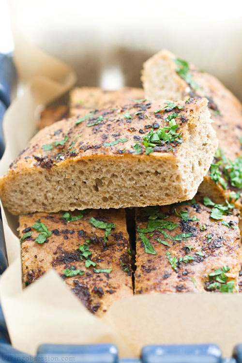 It makes really nice, earthy bread. This focaccia was inspired by Carol Field’s whole wheat focaccia.